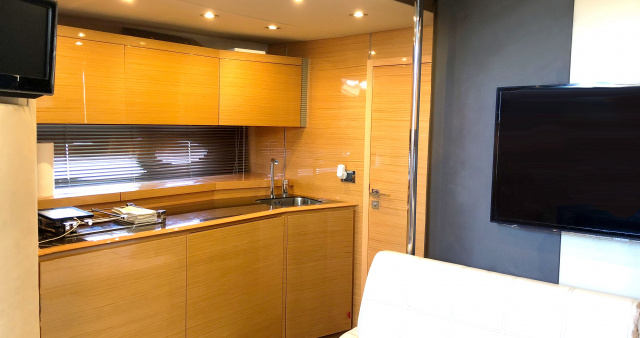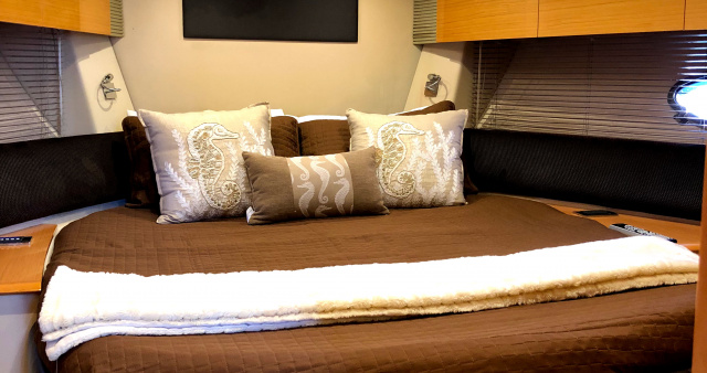 Lounge area saloon has a wood non slip stairway to below deck with courtesy and night lights. Top grade wood flooring and modern furniture. Large LCD TV with satellites, strong stereo system with sub-woofer.