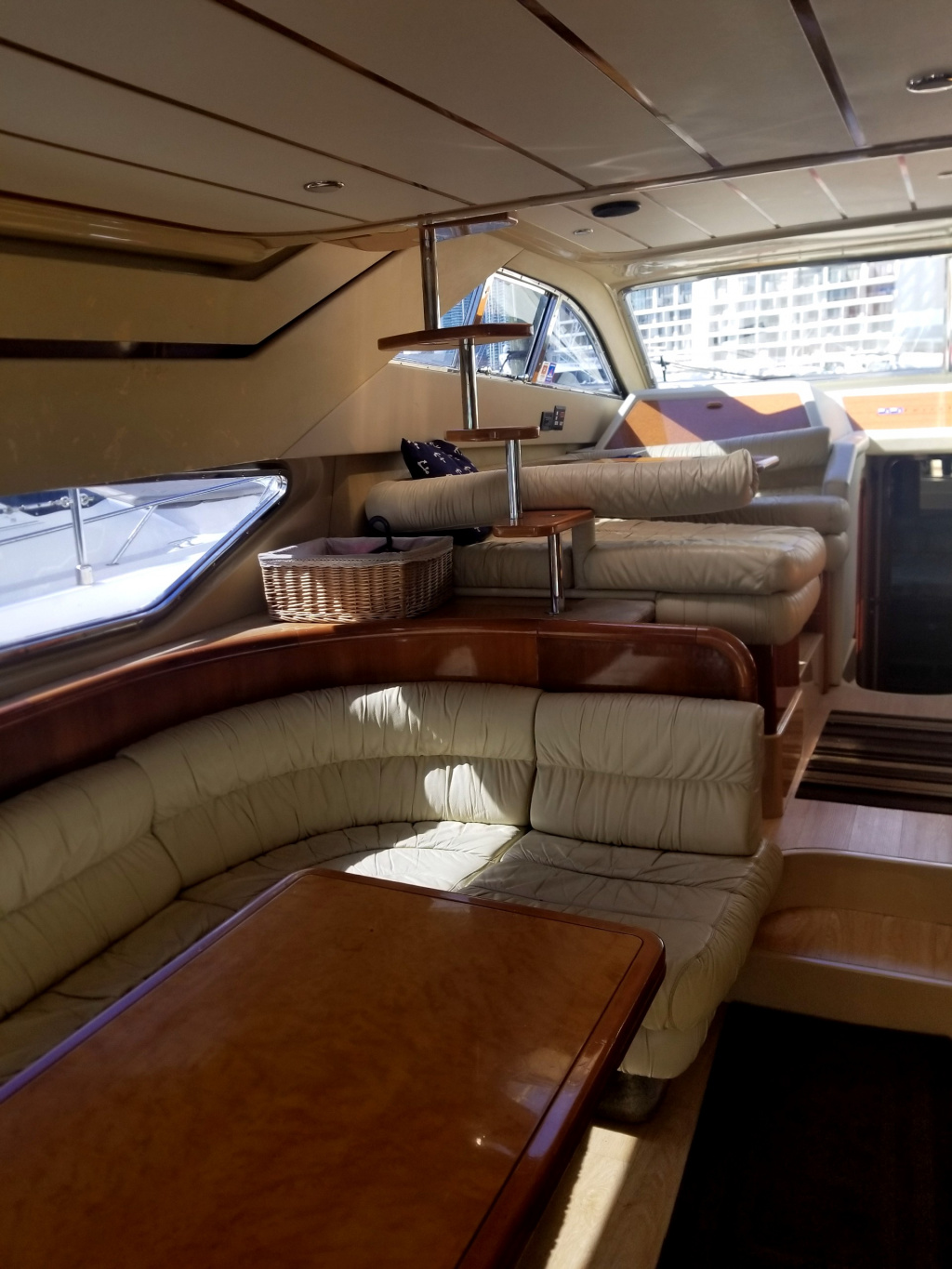 The lower deck is fashioned with four sizable staterooms that offer sleeping accommodations for up to 10 people. The master bedroom itself comes with two small bathrooms, and each stateroom is fully furnished. The extended swimming platform at the aft of the yacht is more than large enough to store a PWC while the raised flybridge offers seating for two as well as a modern control platform. The fore deck is spacious enough to be used as a tanning area.This lavish interior has seating for eight people along with a full dinette.